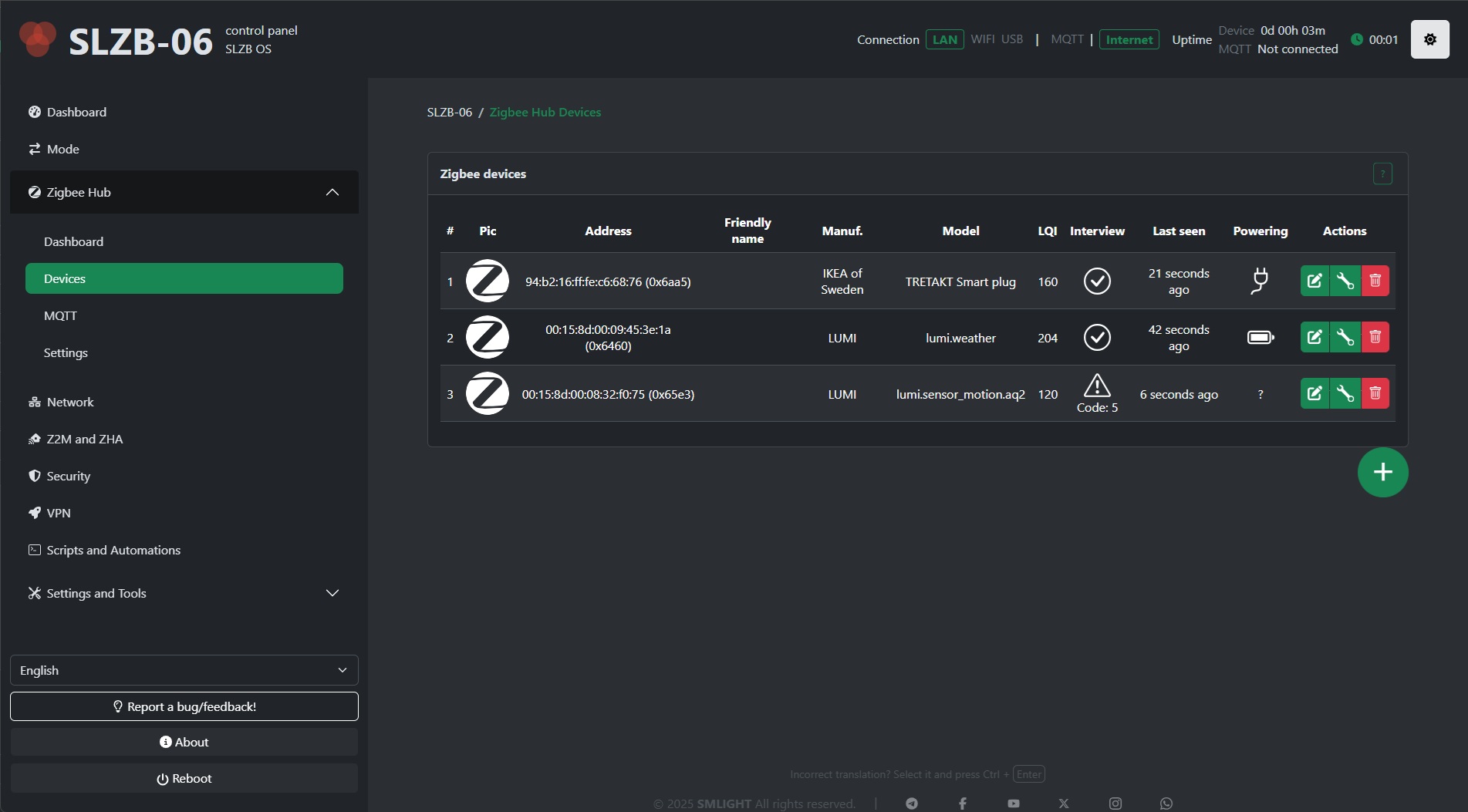However, please note that Zigbee Hub mode is available only on devices based on TI Zigbee chips, such as SLZB-06, SLZB-06P7, and SLZB-06P10. This mode is ideal for small setups where you need basic control (e.g. switching devices, viewing sensors) without full automation. For advanced use cases, Home Assistant or Zigbee2MQTT integration is recommended.